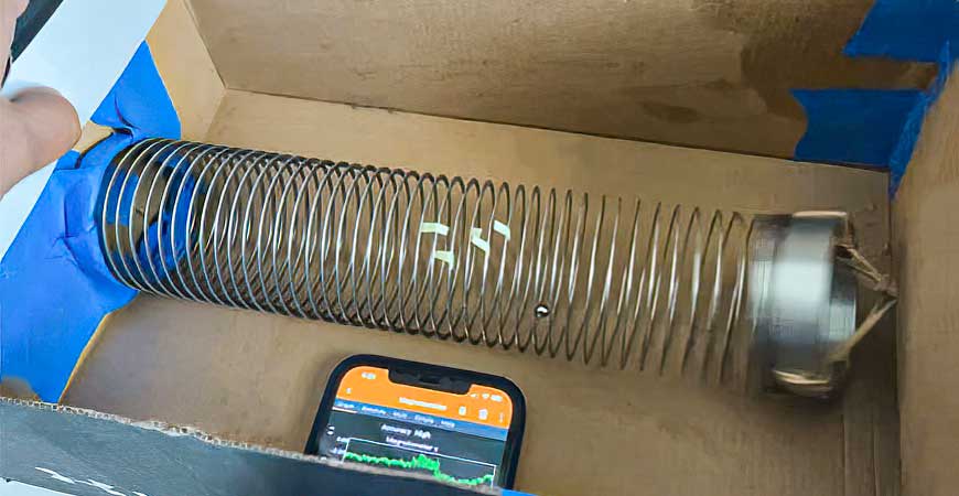 In another experiment, Loera fine-tuned the setup for a metal Slinky to improve measurements of longitudinal waves. A shoebox, some tape and a Sharpie pen reduced vibrational interference and cleaned up the data. Loera dubbed his hand-built instrument the Fixed-Elastic Longitudinal-wave Propagator – FELP, for short.